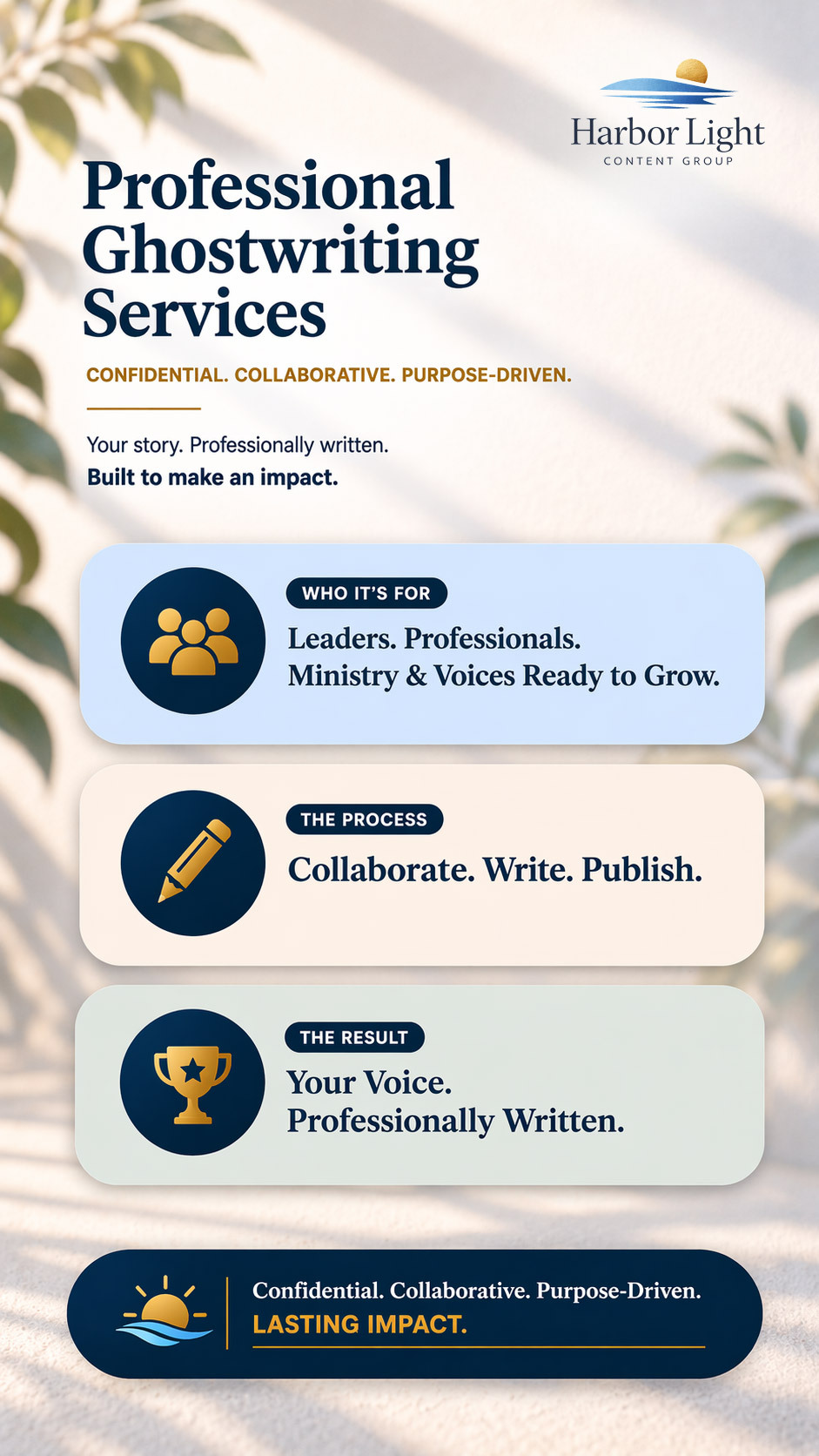 At Harbor Light Content Group, ghostwriting is a professional publishing partnership.