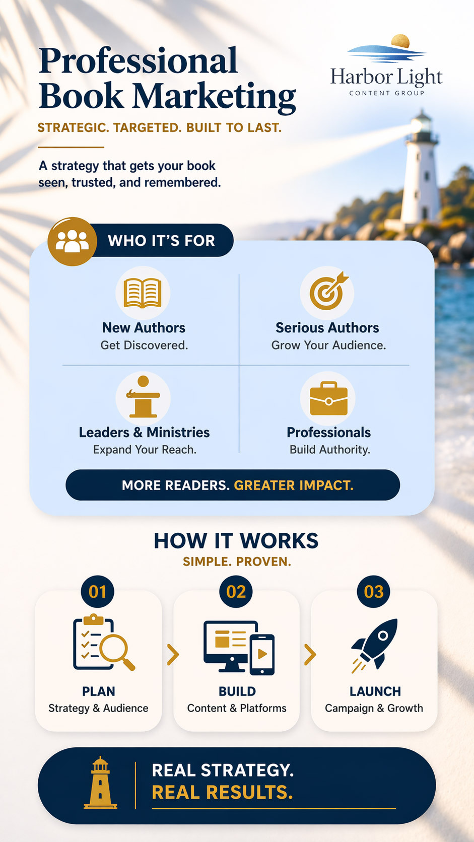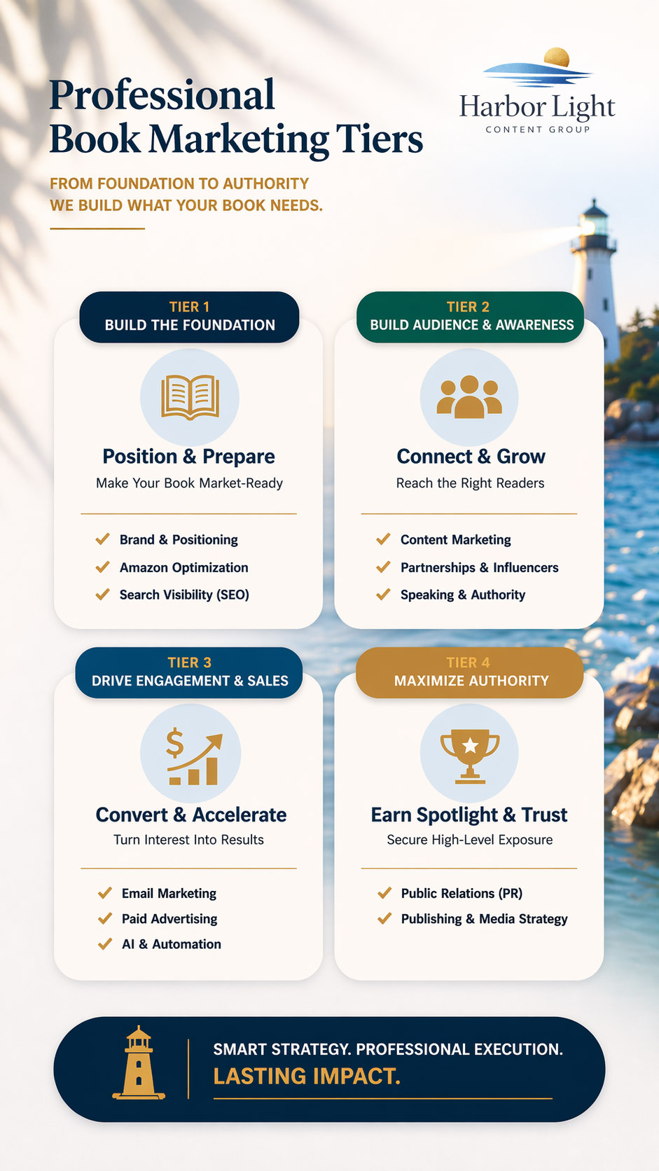 At Harbor Light Content Group, we help authors move their book from written → to professionally positioned in the international marketplace.